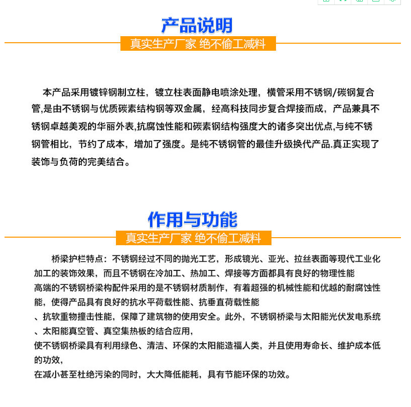 不銹鋼復(fù)合管護(hù)欄采用鍍鋅鋼制立柱,立柱表面靜電噴涂處理,橫管采用不銹鋼/碳 鋼復(fù)合管,是由不銹鋼(SUS304)與優(yōu)質(zhì)碳素結(jié)構(gòu)鋼(Q195-Q235、SPCC )等雙金屬,經(jīng)高科技同步復(fù)合焊接而成,產(chǎn)品兼具不銹鋼卓越美觀的華 麗外表,抗腐蝕性能和碳素鋼結(jié)構(gòu)強(qiáng)度大的諸多突出優(yōu)點(diǎn),與純不銹鋼管相 比,節(jié)約了成本,增加了強(qiáng)度。是純不銹鋼管的升級(jí)換代產(chǎn)品.真正實(shí) 現(xiàn)了裝飾與負(fù)荷的完美結(jié)合。
